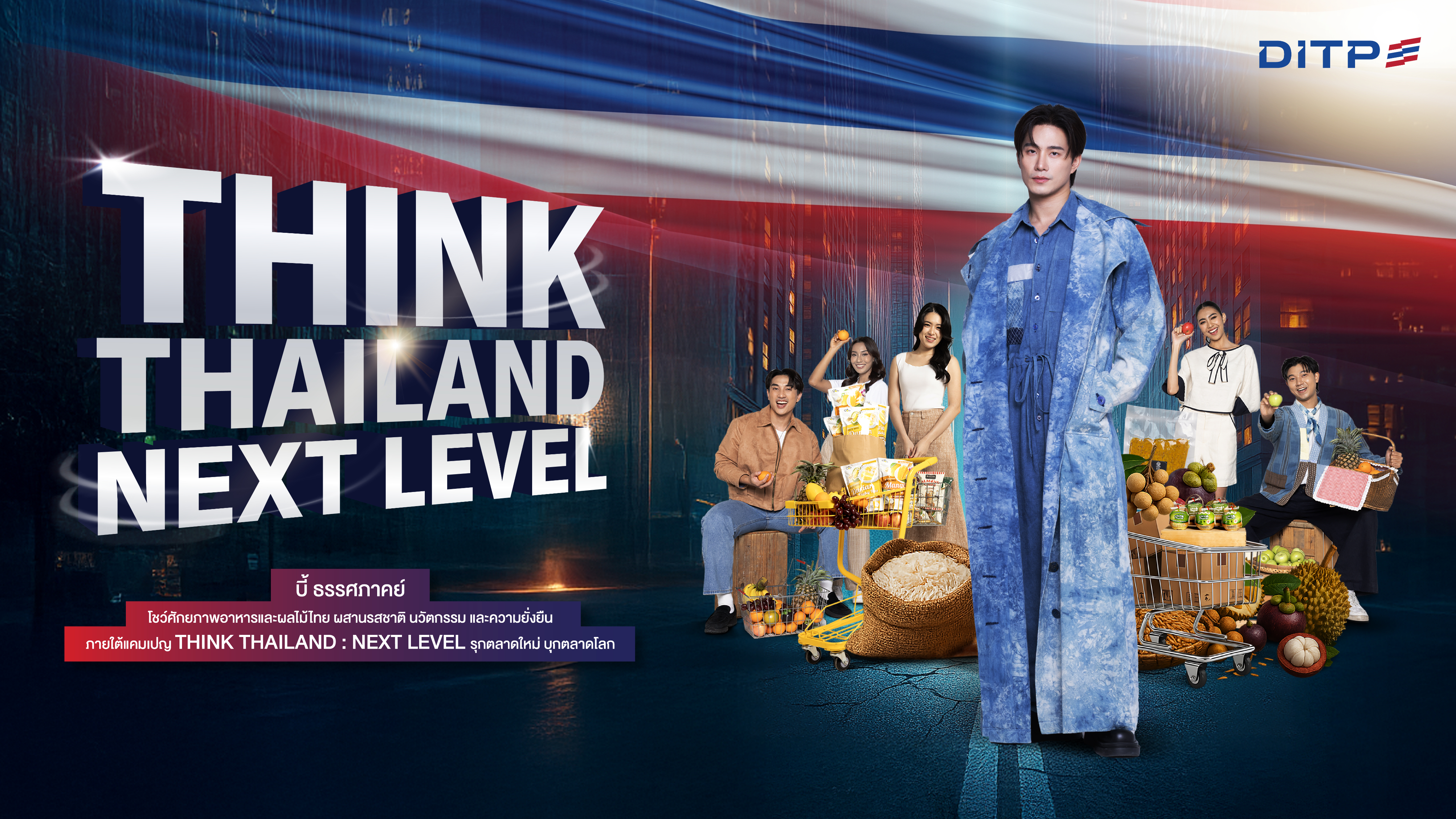 กรมส่งเสริมการค้าระหว่างประเทศ (DITP) กระทรวงพาณิชย์ สานต่อความสําเร็จของโครงการ THINK THAILAND : NEXT LEVEL ในปี 2569 ด้วยการร่วมมือกับ บี้ ธรรศภาคย์ ชี นักร้องและนักแสดงไทยที่ประสบความสําเร็จในตลาดจีน ภายใต้ชื่อ 徐志贤 หรือ สวี จื้อ เสียน (Xú Zhìxián) ในการถ่ายทอดศักยภาพของ อาหารและผลไม้ไทยที่มีความโดดเด่นด้านนวัตกรรม ใส่ใจสุขภาพ ความยั่งยืน รวมทั้งแสดงอัตลักษณ์ ของความเป็นไทย พร้อมโชว์ศักยภาพด้านการค้า ตอกยํ้าจุดแข็งของอาหารและผลไม้ไทยสู่ตลาดโลก ประกอบไปด้วย
